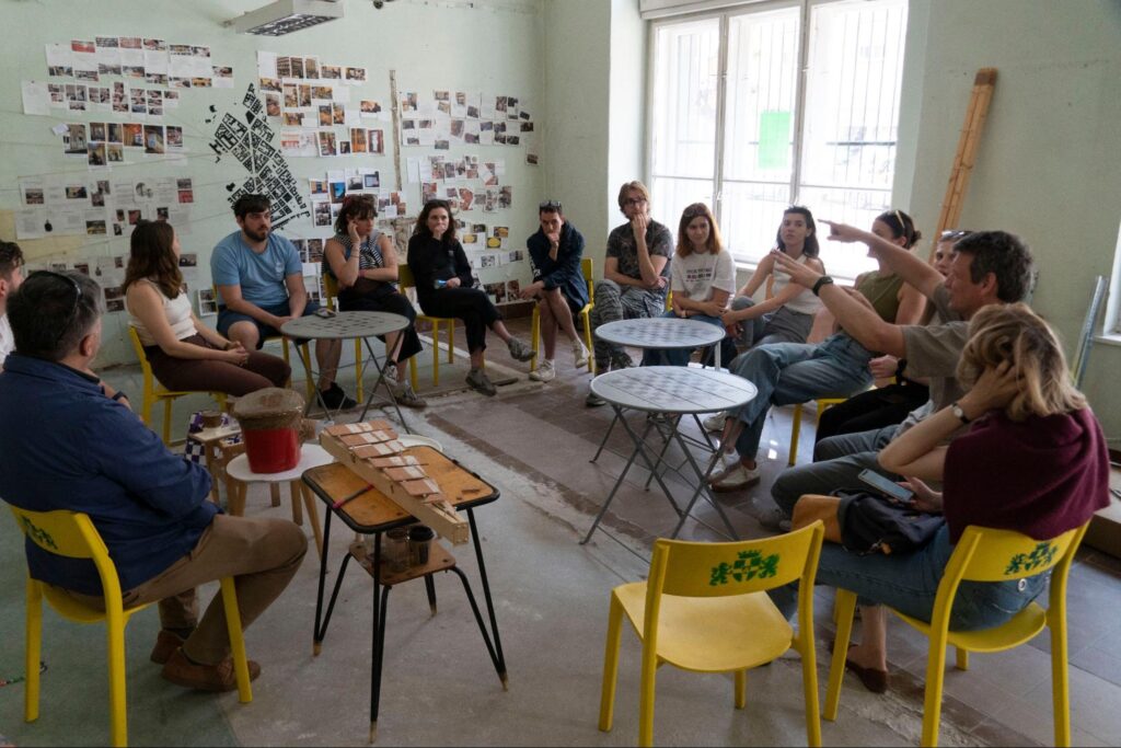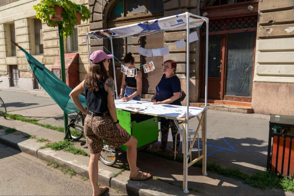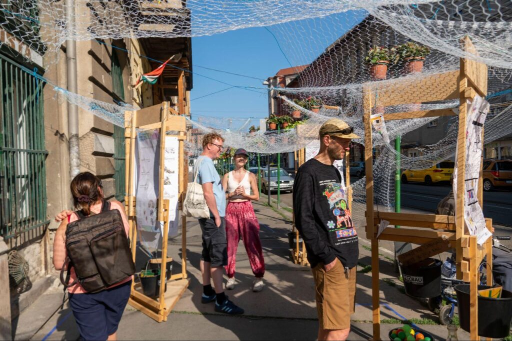 It is relevant to note that this camp focused on processes rather than products. Though students spent the day preparing for the afternoon’s upcoming event, the actual value did not lie in the outcome but in the shared process: group discussions, common preparations and other activities on the streetside and at the parking lot. These activities embodied a temporary occupation of public space, where the most critical aspect was that through this presence, we created vital points of connection with residents. In effect, the group transformed the street in front of the post office into a public living room, open for anyone to join. During the week, local NGOs and organisations like Internép, Auróra or Lehetőségek Tere visited the students, and the group also had some walking tours to socially engaged local venues like Tolnai kert, Dankó udvar or the recently opened Szeszgyár köz a public square equipped with instruments aimed at motivating people to play.