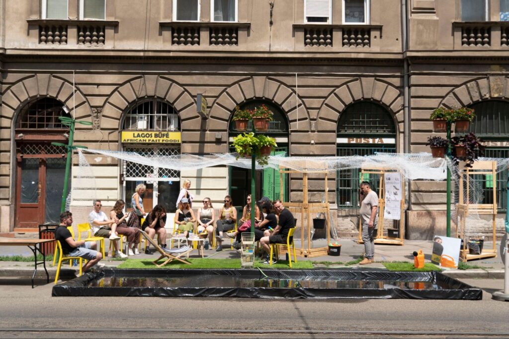 During the camp, it was a conscious decision to make interventions that were both highly related to the actual site but mobile enough to be rebuildable at different locations. The two locations – the pavement extended with a carpark area in front of the post office in Népszínház street, and Szeszgyár köz that is a public square with a playground – showed that different physical and organizational situations induced highly different perceptions and activities of the same object: at Népszínház street the projects intervened into the flow of everyday life when people mainly focus on their daily routines. We wanted to make people stop for a while and invite them to start thinking together about the presence and future of the street. Thus, we needed actions that created surprise and unexpectedness, which are reactions bearing the capacity to suspend accustomed behaviours temporarily. The event at Szeszgyár köz was a municipality-initiated public festival advertised among locals before the event. So people could prepare for the event; thus, surprise was a less relevant factor in this case. This was a common feature of the Budapest100 program in May as well. During these events, it was unnecessary to make people stop since they arrived on purpose; the challenge was creating a platform where people from different backgrounds could meet and acquire a common experience. The installation of a water surface proved effective in both situations as it was able to subvert people’s attention, and it managed to provide community space as well.