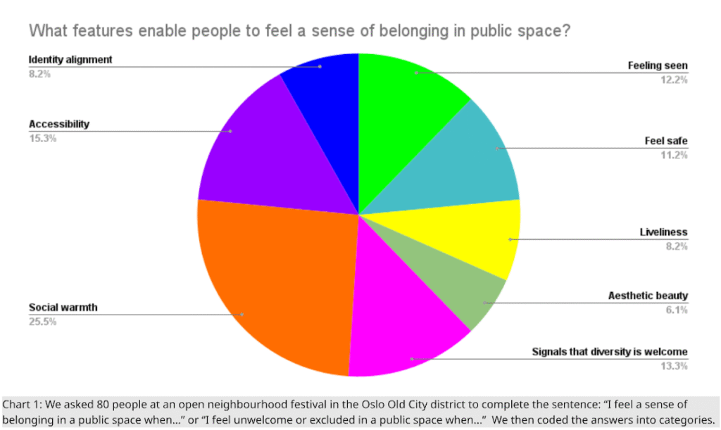 We coded these answers into eight categories, which reflect what it means to feel included in public space in Oslo: 1. Social warmth; 2. Signals that diversity is welcome; 3. Feeling seen; 4. Accessibility; 5. Feel safe; 6. Liveliness; 7. Identity alignment; and 8. Aesthetic beauty.