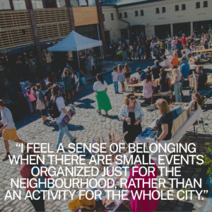Feeling ‘seen’ in the city means not just to be noticed, but also to be valued positively. It encompasses not just physical but psychological recognition–to be noticed, acknowledged, valued, and validated by others and vice versa. Baumeisler and Leary (1995) relate this to belonging, affiliation, and social recognition. They argue that the need to belong requires long term affiliative connection and stability. In their view, being ‘seen’ is therefore a feeling of being accepted as a part of a group or a place. In placemaking practice, we are able to work with building this sense of belonging through action when participants have valuable roles–analysing a space together, planting a garden, co-creating change, building something in public space, protesting together, or picking fruit and pressing juice together.