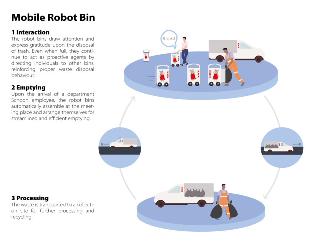 With human-like features, the Mobile Robot Bin is an autonomous robot bin that engages users by rewarding proper littering behavior. The robot moves around within a designated area, performing actions such as expressing gratitude when trash is properly disposed of.  When it came to the design of the robot, Schumann also wanted to actively engage community members, aiming to present the community with a number of design options and allowing them to choose. She says this would both foster “a sense of ownership among the residents” and prepare them “for the arrival of the robots”. Schumann’s current design concept draws upon Karina Schappman’s artwork, an Amsterdam artist known for her work on ‘het Muizenhuis’ (the Mouse House)6.